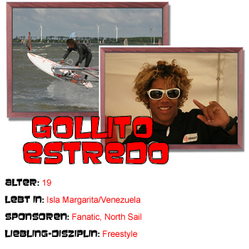 1. Wo ist dein Lieblingsrevier? Ich liebe es in EL Yaque, Isla Margarita/Venezuela zu surfen. 2. Hast du ein Lieblingsboard? Am liebsten fahre ich den Fanatic FreeWave 86 3. Welches Manöver magst du am meisten? Ich finde den Shaka, Flaka und Diablo am besten. 4. Wie hast du mit dem Surfen begonnen? Ich sah einige Jungs, wie mein Bruder auf dem Wasser in EL Yaque und wollte dasselbe tun, aber besser. Ich erhielt ein Brett von meinem Bruder und ein Segel und fing an, auf das Wasser zu probieren. Ich habe mich sofort in den Sport verleibt. 5. Wann war dein bester Windsurftag? Es war auf Lanzarote 2005, wo ich gegen Cheo surfte. 6. Wer sind deine Sponsoren? Fanatic, North Sails, Chiemsee, Dwarf8, ION helfen mir sehr diesen tollen Sport auszuüben. 7. Welche Ziele hast du noch? Ich will wieder Weltmeister werden und vielleicht auch in die welle gehen. Dafür trainiere ich auch meine Kraft. 8. Wie lautet dein Slogan? Ich tue alles, um der Beste zu sein! 9. Was macht du in deiner Freizeit? Ich schaue nach einer passenden Chica für mich. 10. Wie findest du die Backwinddivision? Super, würde ich sonst mitmachen? ---------------------------------------------------------------------------------------------------- |